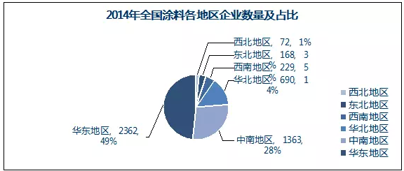 从上图可以看出,华东地区2014年共有涂料生产企业2362家,占全国涂料生产企业的49%;华北地区2014年共有涂料生产企业690家,占全国涂料生产企业的14%;中南地区2014年共有涂料生产企业1363家,占全国涂料生产企业的28%;西南地区2014年共有涂料生产企业229家,占全国涂料生产企业的5%;东北地区2014年共有涂料生产企业168家,占全国涂料生产企业的3%;西北地区2014年共有涂料生产企业72家,占全国涂料生产企业的1%。