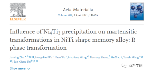 导读:Ni4Ti3沉淀相对NiTi形状记忆合金中的马氏体相变具有重要的影响。但目前其中的一些基本问题仍悬而未决。利用基于相场法的计算机模拟,本文研究了Ni4Ti3沉淀相析出过程中的微观组织演化及其对B2→R 马氏体相变的影响,系统研究了Ni4Ti3沉淀相引起的成分非均匀和内应力场对马氏体相变的耦合作用。发现伴随Ni4Ti3沉淀相的成分非均匀能够明显改变局域的马氏体相变起始温度进而对全域的马氏体相变动力学产生显著影响,而Ni4Ti3沉淀相引起的内应力场能够通过变体选择决定马氏体畴的孪晶结构。因此,有望通过设计沉淀相形成的微观结构开发Invar合金。该研究为理解沉淀相调控马氏体相变的机理提供了基础,能够为材料的热机械处理提供指导,通过设计马氏体相变行获得理想的力学性质。