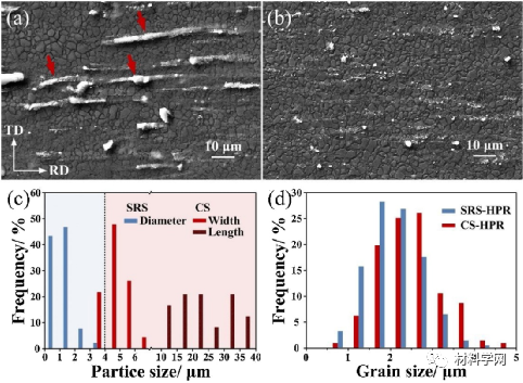 图6 (a) CS-HPR和(b) SRS-HPR样品的SEM显微图及相应的(c)颗粒尺寸分布和(d)晶粒尺寸分布。