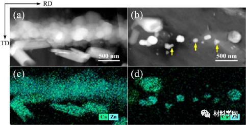 图9 (a) CS-HPR样品和(b) SRS-HPR样品的HAADF-STEM图像,以及(c, d)相应的STEM-EDS图谱(Zn蓝和Ca绿)。黄色箭头表示的是典型的Ca2Mg6Zn3球形碎片。
