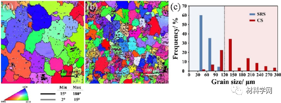 图2 (a)CS和(b)SRS铸态样品的EBSD图和(c)相应的晶粒尺寸分布。未索引的黑色区域是第二相粒子。
