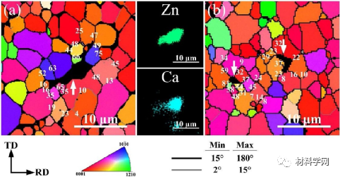 众所周知,传统的轧制工艺很难用于生产具有高Zn、高Ca的难变形Mg-Zn-Ca合金。部分原因是由于沿轧制方向的大剪应力(RD)通常导致较强的基底织构,从而导致变形的边缘开裂。同时,硬脆的粗颗粒是裂纹萌生的优先位置,即使压下量较少,如~20%,也会严重开裂。事实上,生产含有粗颗粒的Mg-Zn-Ca合金板材仍然是一个很大的挑战。