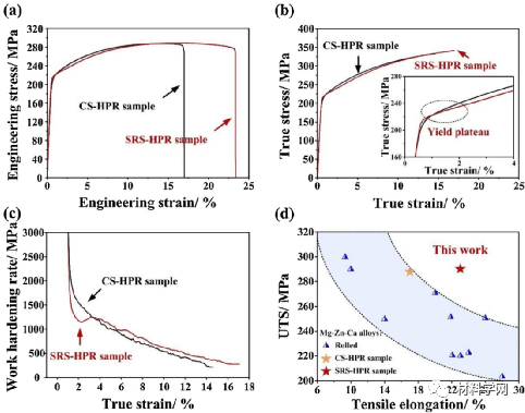 图13 CS-HPR和SRS-HPR试样的室温拉伸试验:(a)工程应力-应变曲线;(b)相应的真应力-应变曲线;(c)加工硬化曲线;(d)拉伸强度与伸长率之间的关系,包括典型的轧制[8,24,56-60]Mg-Zn-Ca合金