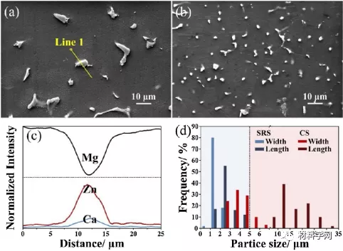 图3 (a)CS和(b)SRS铸态样品的SEM显微图,(c)对应的EDS线扫描图和(d)粒度分布。