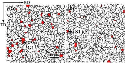 图12 (a) CS-HPR样品和(b) SRS-HPR样品中c轴与ND平行的硬取向晶粒由红色区域标识,公差为10°。