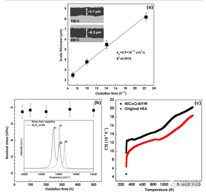 图 4。(a) Al 2 O 3水垢厚度随 1200°C 氧化时间平方根的变化(水垢厚度使用 5000 × BSE 图像中的水垢面积与界面长度的比值和平均值计算)来自五个分离的 BSE 图像)。(b)随着氧化时间的增加,Al 2 O 3鳞片中残余应力的演变(平均值由20个分离点获得)。(c) NiCoCrAlYHf 合金和原始HEA从 25°C 到 1300°C 的CTE 演变。