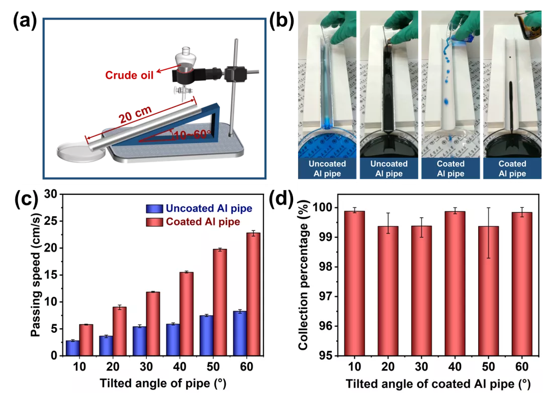 图2:(a)原油运输测试的示意图;(b)水和原油在铝管和涂层铝管内的运输对比;(c)原油流经不同倾斜角度的铝管和涂层铝管的速度;(d)原油流经不同倾斜角度的涂层铝管的收集率。