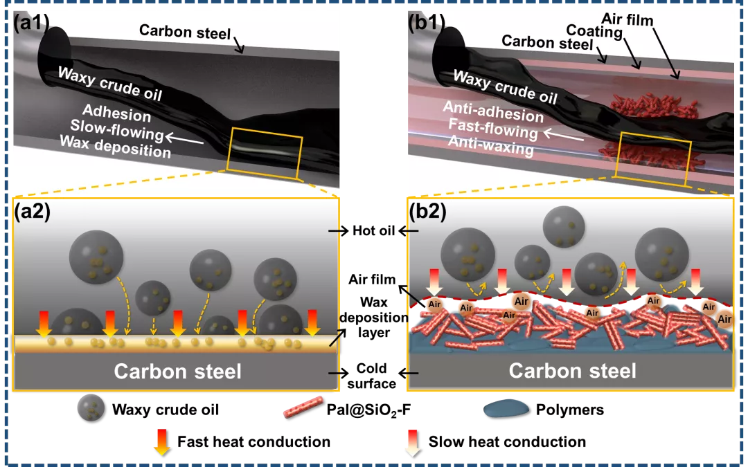 图4:(a1,a2)碳钢表面和(b1,b2)涂层碳钢表面的防蜡沉积机理示意图