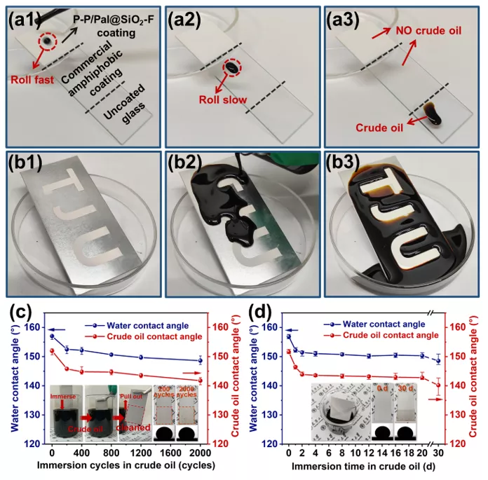 图1:(a)原油液滴在不同表面的滚动情况;(b)原油在涂层区域“TJU”和无涂层区域的润湿性;(c)水和原油的接触角随涂层在原油中浸入-提出循环次数的变化;(d)水和原油的接触角随涂层在原油中浸泡天数的变化。
