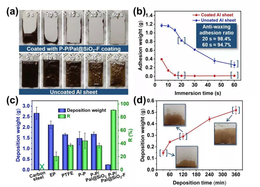 图3:(a)涂层铝板和纯铝板在抗蜡粘附测试中的照片;(b)浸没时间对涂层铝板和纯铝板防蜡粘附率的影响;(c)不同涂层样品的结蜡量和防蜡沉积率R;(d)蜡沉积时间对于涂层的防蜡沉积率的影响。