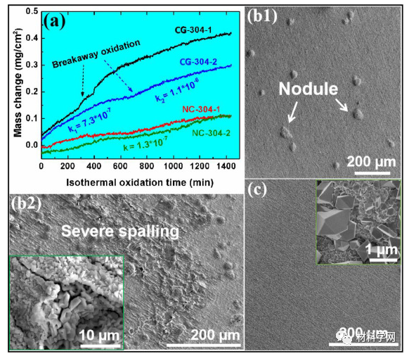 图1。(a) CG-304 和 NC-304 在 900 °C 的氧化动力学(重量增加随时间变化)。(b1) CG-304 样品氧化 840 分钟后的表面 SEM 形态,就在发生分离氧化之后。(b2) CG-304-2 和 (c) NC-304-2 氧化 1440 分钟的表面 SEM 形貌。