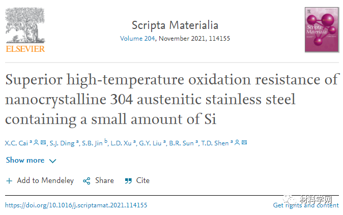 在这里,燕山大学沈同德教授团队开发的具有低于 1 wt.% 的低硅含量的热稳定纳米晶 304 (NC-304)奥氏体不锈钢的高温抗氧化性。 令人惊讶的是,NC-304 表现出至少到 1000°C 的优异高温抗氧化性,展示了一种纳米晶粒策略来设计具有少量 Si 掺杂的抗氧化钢。相关研究成果以题“Superior high-temperature oxidation resistance of nanocrystalline 304 austenitic stainless steel containing a small amount of Si”发表在Scripta Materialia上。