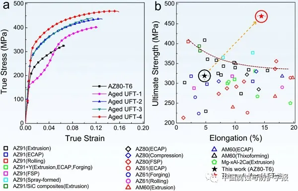 近日,金属所中科院核用材料与安全评价重点实验室许道奎研究员团队与南京工业大学信运昌教授课题组合作在制备高强高耐蚀镁合金材料方面取得重要进展。他们采用多道次三向压缩技术制备孪晶组织,通过对压缩路径及道次应变的独特设计,利用12道次低应变和高应变循环交替压缩,在AZ80镁合金中成功地制备出平均片层厚度约为200 nm的高密度孪晶组织,使平均晶粒尺寸从初始材料的33 mm左右细化至300 nm,其抗拉强度高达469 MPa,是已报道该系列镁合金中强度最高的。利用高密度超细孪晶组织细化晶粒,不仅避免了非平衡晶界对耐腐蚀性能的不利影响,而且改变了β-Mg17Al12相的形貌及分布。β-Mg17Al12析出相呈颗粒状,细小且均匀分布在镁基体中,显著抑制了局部腐蚀的发生,将腐蚀速率降低了一个数量级。该研究成果以“Evading strength-corrosion tradeoff in Mg alloys via dense ultrafine twins” 为题发表在《自然·通讯》(Nature Communications)上。