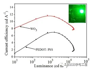 图3.电流效率与亮度的函数关系,插图是在5V电压下基于WO3 NCS的QLED照片。