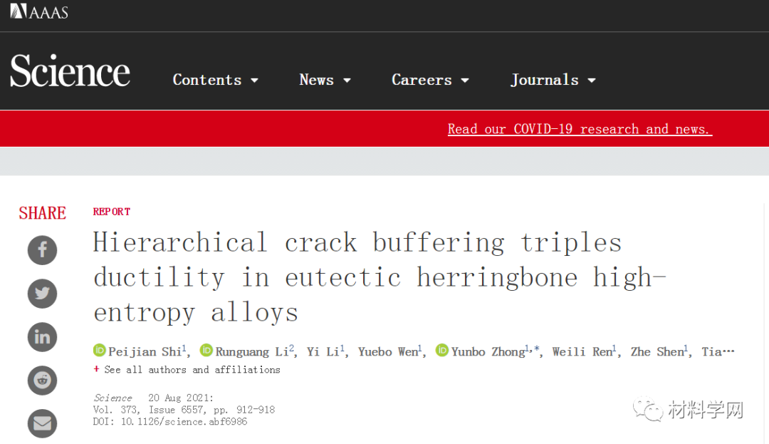 今日,上海大学钟云波教授团队联合北京科技大学王沿东教授团队合作,在“共晶鱼骨高熵合金的开发设计及其辅助的多级裂纹缓冲效应”方面取得重大进展,以Hierarchical crack buffering triples ductility in eutectic herringbone high-entropy alloys为题,在国际顶级期刊《Science》上在线发表。其中上海大学为第一署名单位,上海大学钟云波教授、德国马克斯-普朗克研究所Dierk Rabbe教授和北京科技大学的王沿东教授为共同通讯作者。
