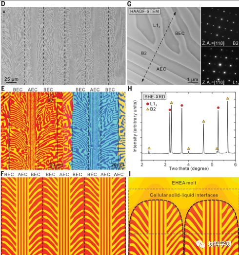 图2 定向凝固的共晶高熵合金,展现出新型的仿生鱼骨状多级共晶结构。图(D)和(E)中的黑色箭头为DS(定向凝固)方向,也是图2A中拉伸加载方向。(D) SEM背散射电子图像显示和(E)放大EBSD相图和IPF图展示出定向生长的多级共晶鱼骨结构。(F和I)多级共晶鱼骨结构示意图及其在定向凝固时的形成原理。(G) B2、Ll2相的HAADF-STEM图像及相关SAED图。(H) SHE-XRD图谱。