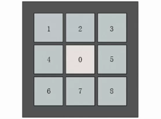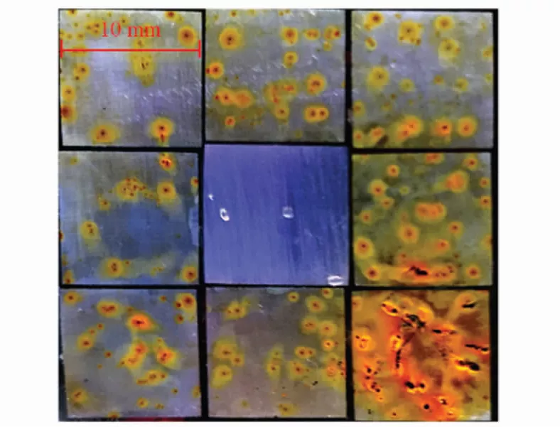 新型传感器为3×3阵列电极传感器,由9个试片按3×3阵列排列,如图1所示。其中,8个试片为X65管线钢,1个试片为304不锈钢,试片尺寸均为10mm×10mm×2mm,工作面的表面积为1cm2,背面焊接铜导线。304不锈钢试片居中(标注为0号试片),X65管线钢试片环绕其四周(标注为1~8号试片),相邻试片的间距为1mm。