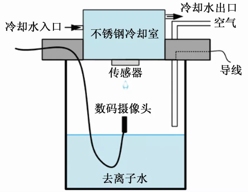 如图2所示,通过泵机向冷却水箱中循环注入温度为10℃的冷却水,使装置顶部环境保持恒定低温。将传感器紧贴于冷却水箱下表面,确保冷却水可以起到良好的冷却作用。试验溶液为去离子水,装置内部与空气连通。将试验装置的玻璃容器部分置于水浴恒温箱中,水浴温度维持在70℃,使装置底部保持恒定的高温。由此,传感器下表面与气体环境之间形成温度梯度,冷凝液滴会在传感器下表面形成。腐蚀性气体溶解在冷凝液滴中,形成顶部腐蚀环境。为了观察液滴的形成和试片的腐蚀过程,在传感器下方安装了数码摄像头,进行观察记录。