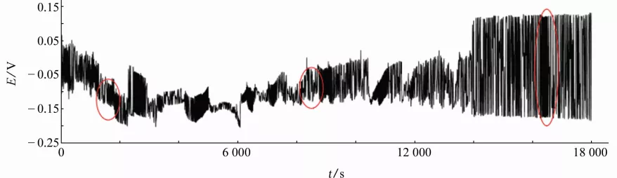 如图7所示,耦合电位表现为幅值较大的正弦信号。试验初期,X65管线钢试片表面布满微小的冷凝液滴,作为工作电极的8个X65管线钢试片与作为参比电极的304不锈钢试片之间没有介质连通,不构成闭合回路。因此,此时无法测得耦合电位,图中正弦信号其实是仪器固有的随机信号。