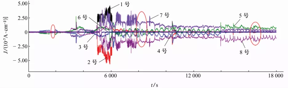 图8 8个X65工作试片之间的电偶电流密度随时间变化曲线