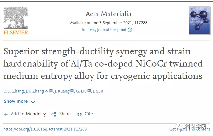 该研究成果日前分别以“Superior strength-ductility synergy and strain hardenability of Al/Ta co-doped NiCoCr twinned medium entropy alloy for cryogenic applications”为题在结构金属材料领域权威学术期刊Acta Mater.上发表。西安交通大学材料学院在读博士生张东东为上述论文第一作者,刘刚教授和张金钰教授为论文通讯作者,西安交通大学金属材料强度国家重点实验室为通讯单位。该工作得到了国家自然科学基金、国家重点研发计划、111计划2.0等项目的共同资助。