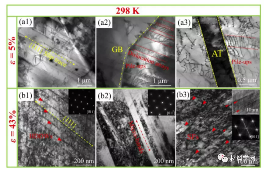 图 7。(NiCoCr) 92 Al 6 Ta 2 MEA 在 298 K 下的典型变形子结构显示了具有不同间断应变(a/5% 和 b/43%)的微观结构演变。(a1) {111}滑移轨迹上的位错滑移(以黄线标记);(a2)和(a3)GB和退火TB的位错堆积,以及平面全位错(用红色平行线标记);(b1) 沿{111}系统的HDDWs形态;(b2) 具有高密度位错的应变诱导微带;(b3) SF 的特征和与 FFT 模式相关联的 SF 的放大图像。