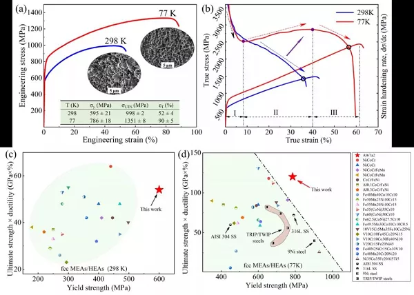 现代工业对极端低温环境服役的高性能结构材料的需求日益迫切(如外太空飞行器、低温恒温器、液氮/氧/氦运输存储等领域),而绝大多数传统金属/合金呈现出温度降低,强度升高但塑韧性下降的现象。近年来,多组元(中/高熵)合金的出现开创了合金材料设计的新理念,并具有突破传统材料诸多性能极限的潜能,使其在极端环境中应用极具前景。其中单相面心立方(FCC)结构的FeCoCrNiMn高熵合金越低温越强韧的特性于2014年首次被发现,随后又发现FCC结构的NiCoCr中熵合金具有比其更高的强塑性和创纪录的断裂韧性。然而,单相NiCoCr中熵合金具有较低的屈服强度,是限制其低温工程应用的主要瓶颈。