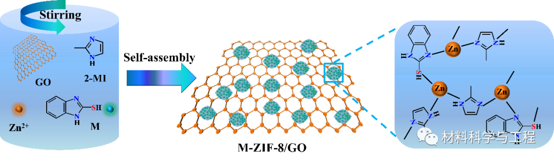 鉴于此,硕士研究生李昊在中科院宁波材料所赵文杰研究员和北京科技大学强玉杰副教授的联合指导下,选择了一种环保的药物型缓蚀剂2-巯基苯并咪唑(M),将其原位嵌入氧化石墨烯纳米片(GO)上的沸石咪唑骨架-8(ZIF-8)中,制备了具有良好分散性和功能性的M-ZIF-8/GO复合纳米材料。并进一步将该纳米材料引入水性环氧树脂中,制备了具有优异主动防护性能的M-ZIF-8/GO/EP复合涂层。GO纳米片能在涂层内部形成迷宫阻隔效应,而由锌离子、2-甲基咪唑和2-巯基苯并咪唑构成的M-ZIF-8,则能有效的提升涂层的交联密度和填料的相容性,且能高效释放缓蚀剂。