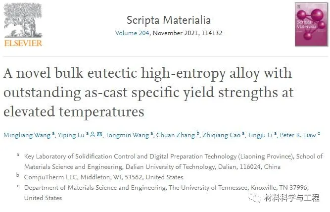 开发在高温下具有优异性能的轻质、低成本的结构材料一直是研究人员追求的方向。迄今为止,广泛用于燃气涡轮发动机和航空发动机的传统镍基高温合金的最高使用温度已达到其熔点的80%。因此,这些高温合金已无法满足工作温度进一步升高而产生的更严苛的使用要求。共晶高熵合金(EHEAs)结合了高熵合金(HEAs)和共晶合金的优点,并表现出可控的、接近平衡的微观结构,可以抵抗温度变化直至共晶点,是高温下应用的绝佳候选者。EHEA具有良好的可铸性,可以通过直接铸造制成工业规模的铸件。因此这种EHEA因其卓越的强度和延展性而受到关注。