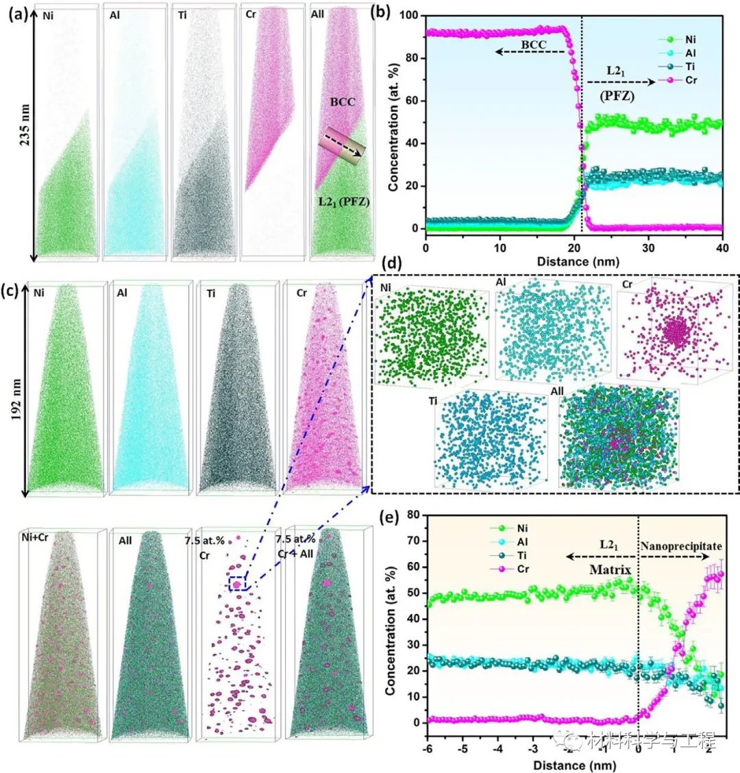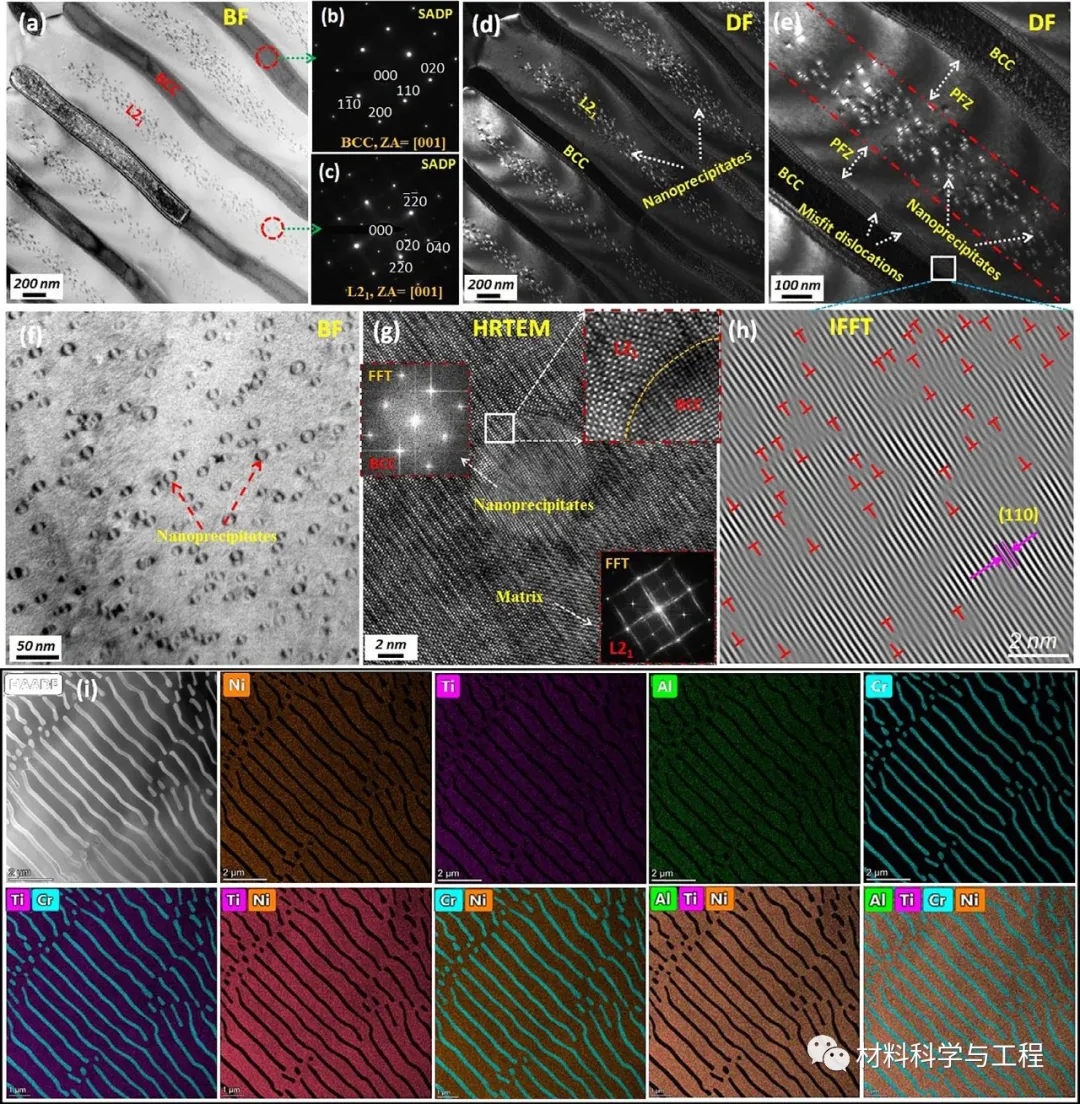 研究发现AlCr1.3TiNi2合金由BCC和L21相组成。2θ值为26.1°和30.3°的低角度超晶格衍射峰分别来自于有序L21相的(111)和(200)面,其计算晶格参数(aL21)为0.5895 nm。BCC相的晶格参数(aBCC)计算为0.2892 nm,BCC和L21相之间的晶格失配通过计算后确定为1.90%,这表明两相之间的界面是半共格的。EBSD图中细薄片(平均宽度约为270 nm)具有BCC结构,而粗薄片(平均宽度约为510 nm)具有L21结构。BCC相富含Cr(含有超过90% Cr)。富含Ni、Al和Ti的L21相可以表示为Ni2AlTi,这是一类Heusler型有序相,具有L21结构。