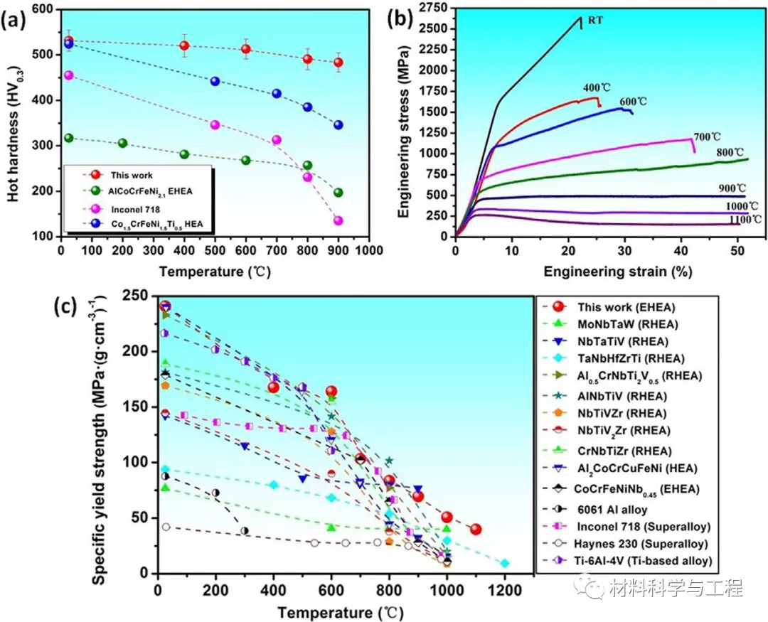 在常温下,AlCr1.3TiNi2和Co1.5CrFeNi1.5Ti0.5具有相似的硬度值,但AlCr1.3TiNi2 EHEA在较高温度下的性能远远优于Co1.5CrFeNi1.5Ti0.5HEA。AlCr1.3TiNi2 800℃时的平均硬度值为490.7 HV,900℃时的平均硬度值为483.5HV,在相同温度下,远高于Co1.5CrFeNi1.5Ti0.5HEA(约385 HV和346 HV)的值,这表明AlCr1.3TiNi2EHEA具有出色的抗高温软化性能。在超过800℃的温度下,合金在超过50%的压缩应变下没有断裂,这表明AlCr1.3TiNi2 EHEA具有优异的高温塑性。AlCr1.3TiNi2 EHEA在室温和高温下均保持较高的比屈服强度(SYS)。