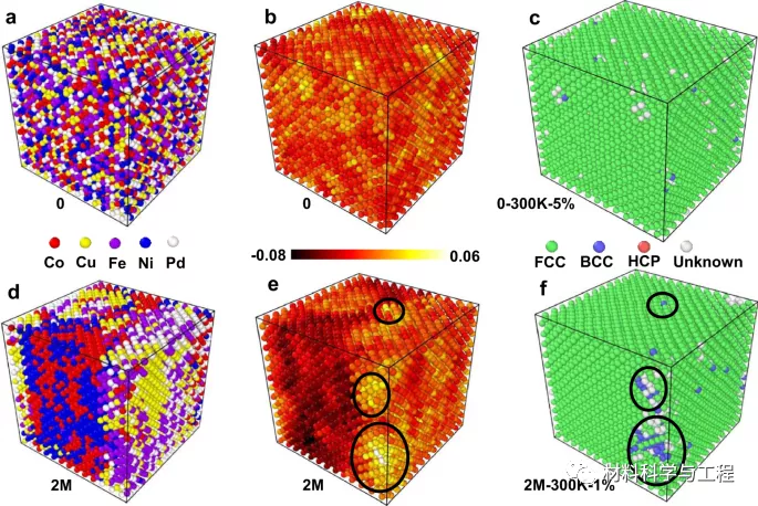 图3 在300 K时,CoCuFeNiPdHEA在0(0样品)和2×106 (2 M样品)迭代时的原子构型、相稳定性和局部结构。