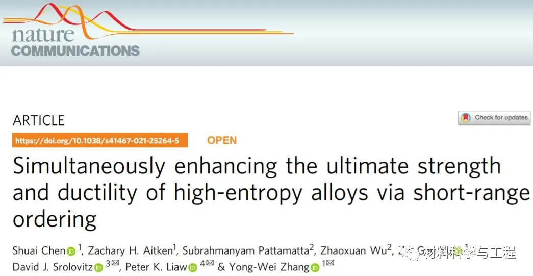 将金属和合金的强度和延展性同时提升,一直是一个巨大的挑战。在此,来自香港大学、美国田纳西大学、新加坡高性能计算研究所等单位研究者,采用蒙特卡罗方法、分子动力学模拟和密度泛函理论计算相结合的方法,研究了CoCuFeNiPd高熵合金(HEA)。相关论文以题为“Simultaneously enhancing the ultimate strength and ductility of high-entropy alloys via short-range ordering”发表在Nature Communications上。