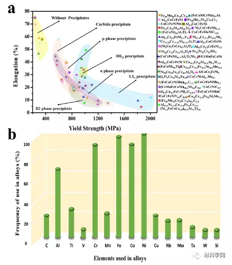 图三 纳米相的类型及其对强度的贡献,以及纳米相强化HEAs中使用元素的频率。a) 纳米相主要包括碳化物、μ相、D022沉淀相、σ沉淀相、L12沉淀相和B2沉淀相。其中,L12和D022沉淀相能有效强化合金,同时保持良好的塑性。碳化物可以保持合金的塑性,但对强度的贡献不大。而μ、σ和B2相通常对合金的塑性有负面影响。b) 在纳米相强化HEAs中,Cu、Mn、Al、Co和其他一些元素的使用频率发生了变化(样品数量为60)。这主要是由于Mn和Cu在时效过程中对合金性能的负面影响,而Al和Co被广泛用作纳米相的形成和稳定元素而被大量使用。