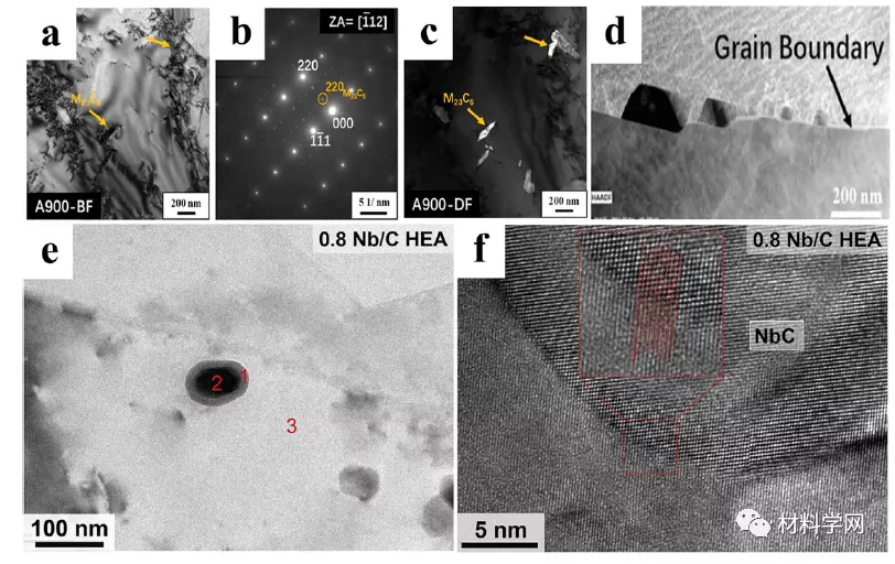 图四 纳米级碳化物的形成。在900°C下时效的Al0.3Cu0.5FeCrNi2 HEA:a) M23C6在基体中析出。b) 衍射花样。c) 暗场图像由b)中的(220)-M23C6拍摄。d) 晶界处沉淀。(CrMnFeCoNi)98.4Nb0.8C0.8 HEAs的显微结构:e) TEM-暗场图像显示了核壳结构。f) HRTEM图像显示基体和NbC颗粒之间的共格性。