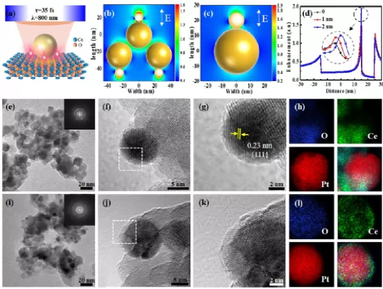 图2.超快激光诱导SMSI之后的表征,(a-d)激光辐照过程中局部增强电场FDTD模拟;(e-h)新鲜Pt/CeO2的TEM和Mapping; (i-l)激光辐照后Pt/CeO2的TEM和Mapping.
