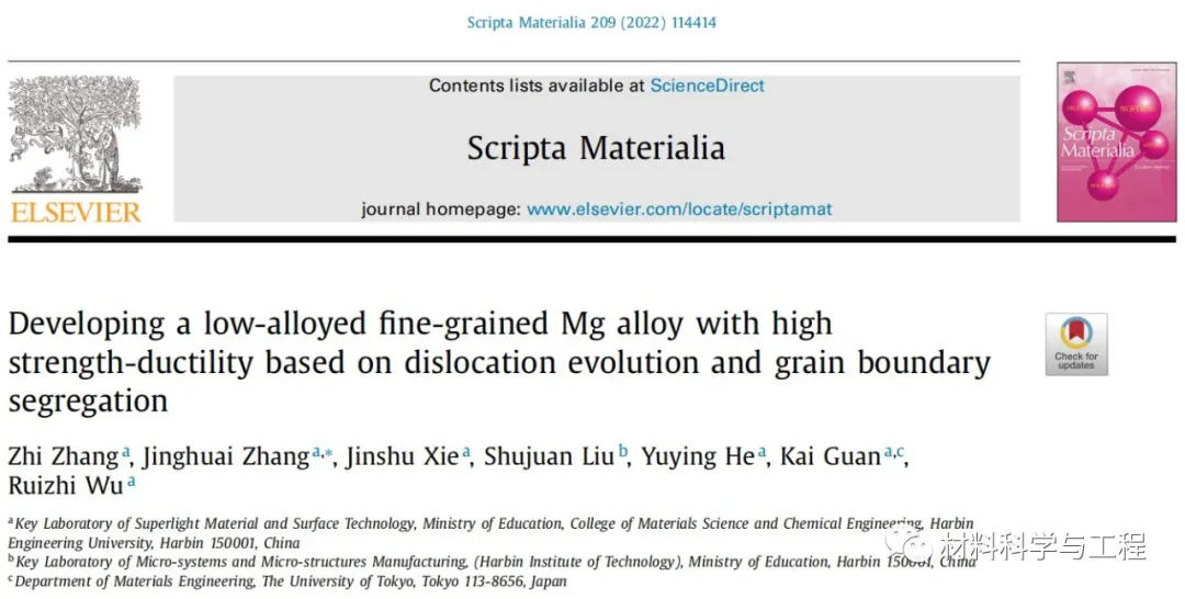 近期,哈尔滨工程大学的张景怀课题组综合利用晶界偏聚和位错调控开发出低合金化高强塑性细晶镁合金。相关论文分别以“Developing a low-alloyed fine-grained Mg alloy with high strength-ductility based on dislocation evolution and grain boundary segregation”和“Significantly enhanced grain boundary Zn and Ca co-segregation of dilute Mg alloy via trace Sm addition”为题发表于Scripta Materialia和Materials Science & Engineering A。