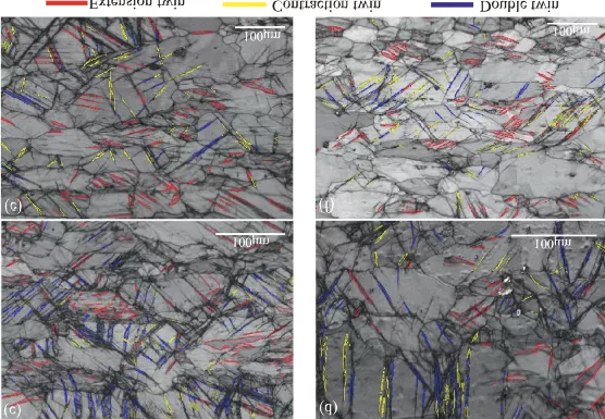 在图3c和d中,GS镁合金的CG核和均质CG镁合金在拉伸试验后通过EBSD映射的衍射带对比图适应于区分梯度结构对可塑性过程中孪晶演化的影响。显然,在GS镁合金样品的CG核心区域中,不同取向的相交孪晶密度要高得多。相比之下,在拉伸至破坏后的均质CG Mg合金样品中仅观察到相对较少的平行孪晶。通过孪晶界取向错误分析,我们可以进一步确定GS镁合金和CG镁合金样品的CG核中的孪晶类型。在CHANNEL 5软件中,错误定向角的最大偏差设置为10°。如图中不同颜色所示,在单轴拉伸过程中形成了三种变形孪晶,包括{101?2} 红色的扩展双胞胎,{101?1}黄色的收缩双胞胎和{101?1}-{101?2}蓝色双胞胎。可以肯定的是,更高的孪晶密度和多取向孪晶之间更多的相互作用有利于提高GS镁合金的塑性和硬化能力。然而,应该注意的是,图3c和d都是在破坏后的拉伸样品上获得的,GS Mg合金样品的破坏应变远大于CG Mg合金样品的破坏应变。必须仔细分析较大应变对双胞胎形成的影响,尤其是具有多个取向的双胞胎。因此,我们只是在失效前将GS和CG镁合金样品扩展到指定的10%应变,然后再次进行EBSD映射。在图3e和f类似地,GS样品的CG核心出现了更多具有多个取向的孪晶,但孪晶的宽度稍细一些。这意味着多向双胞胎应该发生在可塑性的早期阶段。这与GS样品的应变硬化率趋势一致,在塑性变形开始时高于均质CG合金。此外,由于GS镁合金样品经历了严重的塑性表面处理,因此该CG核心区域中晶粒的结晶织构也应被视为影响孪晶类型的另一个不可忽略的因素。为此,我们在单轴拉伸试验之前绘制了均质CG镁合金的极图和 GS 镁合金的CG磁芯。1?0}<0001>存在,但在进一步的RASP处理后,由于核心区域的塑性变形非常有限,因此在GS镁合金的 CG核心中没有出现织构成分或强度的差异。因此,它应该有一些其他原因激活更多的双胞胎,特别是引起多方位双胞胎之间的相互作用。综上所述,对于GS镁合金样品的三个区域,我们在本节中系统地分析了各自的机制。最有趣的发现是由于引入了建筑梯度结构而导致的相交变形双胞胎的出现。因此,需要更多的努力来发现多向双胞胎激活和相互作用的驱动力。