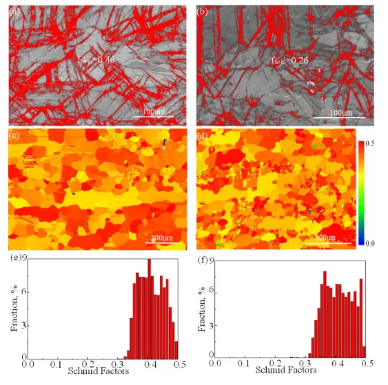 图5。单轴拉伸破坏后的变形孪晶比例和单轴拉伸前收缩孪晶对应的Schmid因子。(a) GS镁合金CG核内单轴拉伸破坏后的取向和形貌,根据显微组织观察结果提取的变形孪晶比例;(b)在原样的均质CG样品中,根据单轴拉伸破坏后的取向和形貌,在显微组织观察结果中提取的变形孪晶比例;(c) GS Mg合金CG核心的Schmid因子的等高线图;(d) 均质CG样本的 Schmid因子的等高线图;(e) GS镁合金CG核心的Schmid因子统计数据;(f) 均质CG样本的Schmid因子的统计数据。