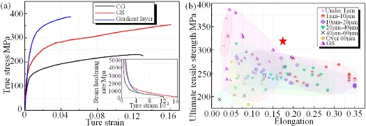 图2。GS AZ31镁合金样品在298 K准静态单轴拉伸试验下的机械性能。(a) GS镁合金样品、原样均质CG镁合金样品和独立梯度层以及随着拉应变的增加,应变硬化率的演变;(b)不同平均晶粒尺寸或梯度结构的AZ31镁合金力学性能的统计集合。