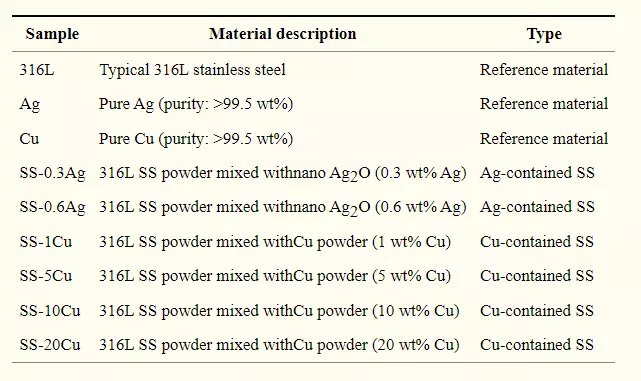 为了解决这两个局限,研究人员使用铜粉和纳米级氧化银粉末,与不锈钢粉混合,制备不同质量分数的铜-不锈钢与银-不锈钢混合物,再通过烧结形成盘装固体。同时,以纯铜、纯银、纯不锈钢作为实验的对照组。