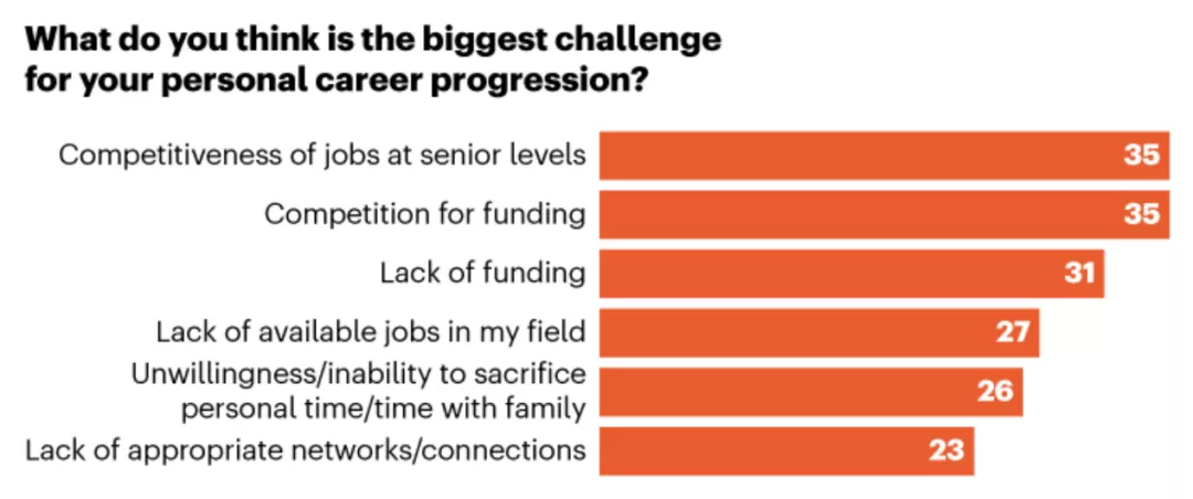 只有9%的受访者表示,他们的职业生涯因缺乏技能而受阻,如特定实验技术技能、计算机相关技能。