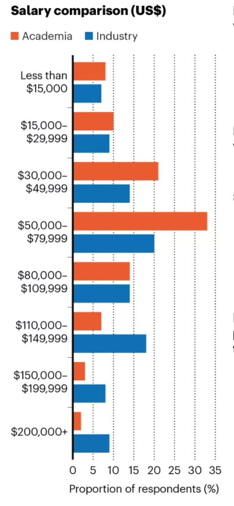 高薪在工业界比在学术界更为普遍。17%的工业界受访者表示,其每年收入超过15万美元,这在学术界只有5%。