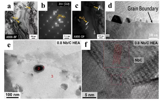 图四 纳米级碳化物的形成。在900°C下时效的Al0.3Cu0.5FeCrNi2 HEA:a) M23C6在基体中析出。b) 衍射花样。c) 暗场图像由b)中的(220)-M23C6拍摄。d) 晶界处沉淀。(CrMnFeCoNi)98.4Nb0.8C0.8 HEAs的显微结构:e) TEM-暗场图像显示了核壳结构。f) HRTEM图像显示基体和NbC颗粒之间的共格性。