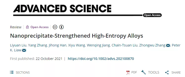 导读:近日,哈尔滨工程大学张中武教授团队联合美国田纳西大学Peter K. Liaw教授和香港城市大学刘锦川教授在期刊AdvancedScience(影响因子16.806)在线发表了题为“Nano-precipitate-Strengthened High-Entropy Alloys”的综述论文。评述了近年来纳米相强化高熵合金(HEAs)的研究进展;归纳总结了高熵合金中可用的纳米强化相及其影响因素,讨论了合金的高熵特性对纳米相形成热力学和动力学的影响;重点介绍了HEAs中纳米相的设计策略、控制方法和强化机理,并对新型高性能纳米相强化高熵合金的研究和设计策略进行了展望。该研究受到国家重点研发计划、中核集团青年英才计划菁英项目、国家自然科学基金、国防科技工业核材料技术创新中心等项目支持。哈尔滨工程大学在读博士生刘力源和张洋副教授为共同第一作者,张中武教授和PeterK. Liaw教授为共同通讯作者。