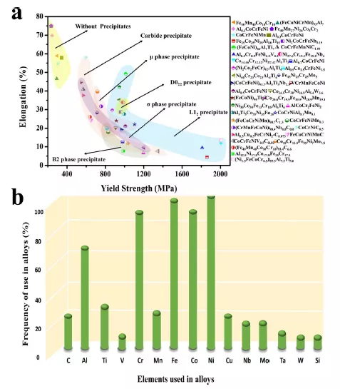 图三 纳米相的类型及其对强度的贡献,以及纳米相强化HEAs中使用元素的频率。a) 纳米相主要包括碳化物、μ相、D022沉淀相、σ沉淀相、L12沉淀相和B2沉淀相。其中,L12和D022沉淀相能有效强化合金,同时保持良好的塑性。碳化物可以保持合金的塑性,但对强度的贡献不大。而μ、σ和B2相通常对合金的塑性有负面影响。b) 在纳米相强化HEAs中,Cu、Mn、Al、Co和其他一些元素的使用频率发生了变化(样品数量为60)。这主要是由于Mn和Cu在时效过程中对合金性能的负面影响,而Al和Co被广泛用作纳米相的形成和稳定元素而被大量使用。