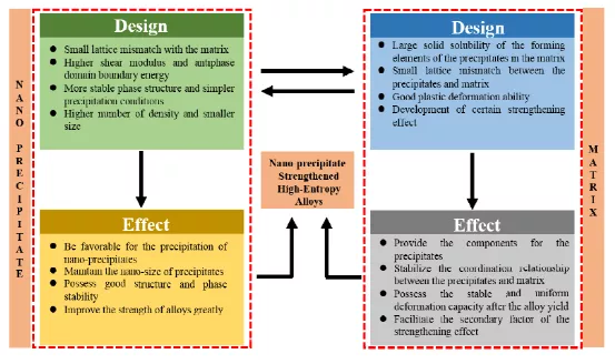 图七 纳米相强化HEAs的设计策略。包括两个方面:纳米相和基体相。多组分/高密度纳米相在保持良好塑性的同时,对强度的贡献要更大。基体相应具有良好的变形能力,提供强化效果的二次来源。纳米相与基体相并不是孤立的,应注意这两相之间的配合。