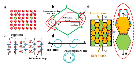 图二HEAs的强化机制。a)固溶强化。溶解在基体中的原子引起晶格畸变,增加了位错运动的阻力,使滑移难以进行,从而提高了合金的强度(蓝色的球代表间隙原子;粉红色球表示与基体原子大小相似的替换原子;绿球代表半径较大的取代原子)。b) 晶界强化。由于晶界两侧晶粒取向不同,导致晶界附近的滑移阻力增大。因此,滑移带不能直接进入临近的晶粒中。c) 位错绕过机制。移动位错被阻挡并弯曲形成位错环。d) 位错切过机制。位错在析出物的剪切过程中产生了共格强化、模量强化和有序强化等。e)双相强化。在双相结构的合金中,软相被拉长,提供变形能力,如放大图所示。而硬相则通过阻止位错的运动来提供强度。