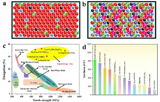 图一 传统合金和HEAs的原子分布、强度和硬度的比较。a) 传统合金中原子分布示意图。形成的是稀固溶体,少量溶质原子占据晶格位置,并被大量溶剂原子包围。b) HEAs中的原子分布示意图。由多组分组成,不同半径的原子随机占据晶格位置,导致严重的晶格畸变。c) HEA和传统合金之间的强度比较。通常HEAs具有较高的延伸率,但强度较低。d)HEAs、17-4 PH不锈钢、哈氏合金和316不锈钢的硬度比较。可以看出,具有单相FCC结构的CoCrFeNiCu HEA的硬度非常低(低于200 HV),而具有BCC结构的MoTiVFeNiZrCoCr HEA的硬度值非常高(超过800 HV)。