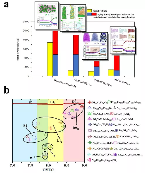 图六 L12和D022纳米沉淀相对HEA强度的贡献,以及总价电子浓度(OVEC)对纳米相形成的影响。a) 一般来说,纳米相的贡献可以使强度加倍。插图对应于不同元素的原子图和纳米相的三维结构。b) OVEC对沉淀相形成的影响。OVEC>8.4有利于D022纳米沉淀相的析出;当OVEC在7.7至8.4时, L12纳米相易于形成;σ相和μ相形成的OVEC在7.8~8.2之间;OVEC在7.3到8.0之间有利于B2纳米相的形成。